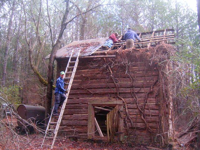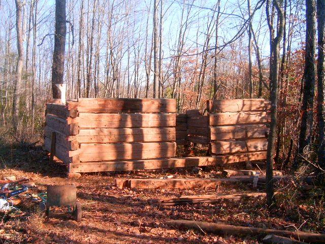 Logs, from old tobacco barns and a cabin, were cut to meet the specifications needed and were notched together to re-create structures original to the farm, replicating construction methods used in 18th and 19th century America. Old logs were recovered from buildings in Durham, Greensboro, Yadkinville, and Wilkes County. Although Mike oversaw the operation, donations of money and/or manual labor by family members made redevelopment possible. On occasion total strangers, curious about the careful dismantling of old buildings, pitched in by offering machinery and manpower to facilitate loading and hauling the logs to the farm. Mike documented each step of the reconstructed farm buildings photographically, with some examples shown here.
